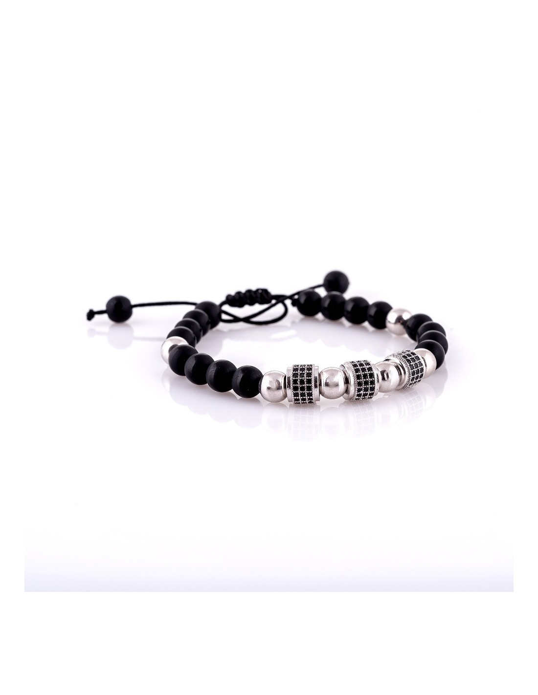 Bratara unisex,ajustabila,snur negru ,argint si bilute din onix semipretioase mate.